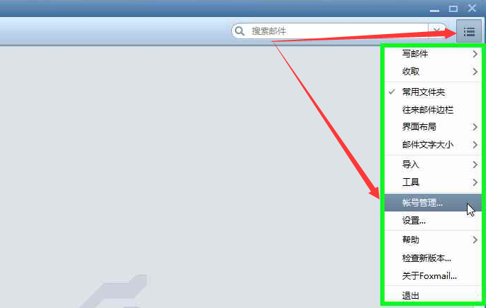 邮箱客户端我这里使用foxmail。启动foxmail,点击其左上角的菜单,点击“帐号管理”