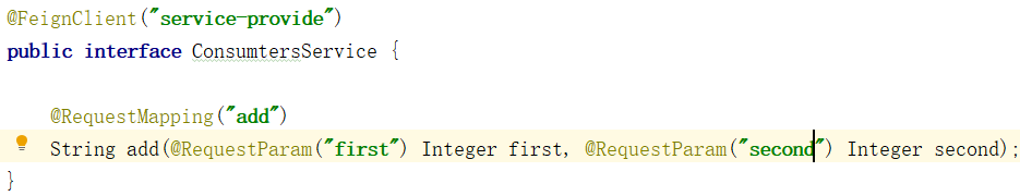 发现这样写就跟我们用dubbo差不多,通过注入服务的方法就能调用,这里面要注意的地方是你写的这个接口里的方法里面传的参数一定要指定参数名,否则启动项目会报一个错误