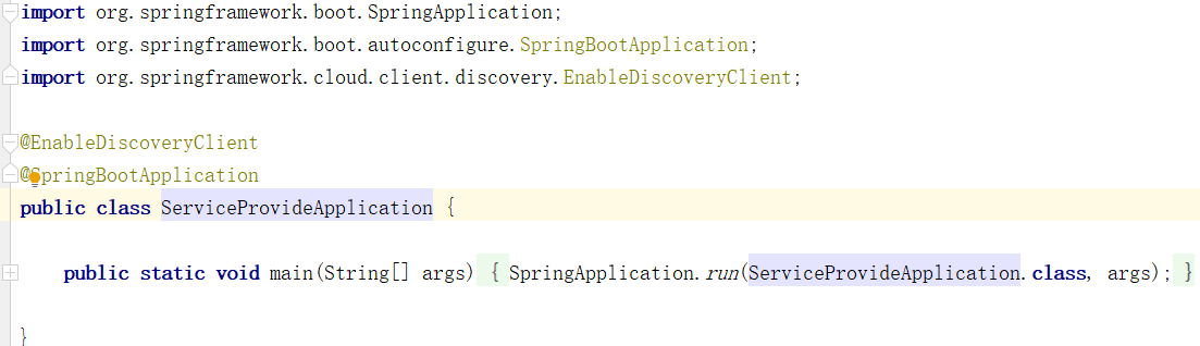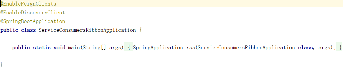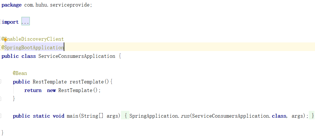 现在服务的注册中心跟提供者都有了,我们需要在创建一个消费者,消费者调用我们写好的方法,输出结果。这篇文章会介绍几种服务的消费者,先以LoadBalancerClient为例写一个例子,创建一个新项目再主程序上添加注解@EnableDiscoveryClient,并添加文件: